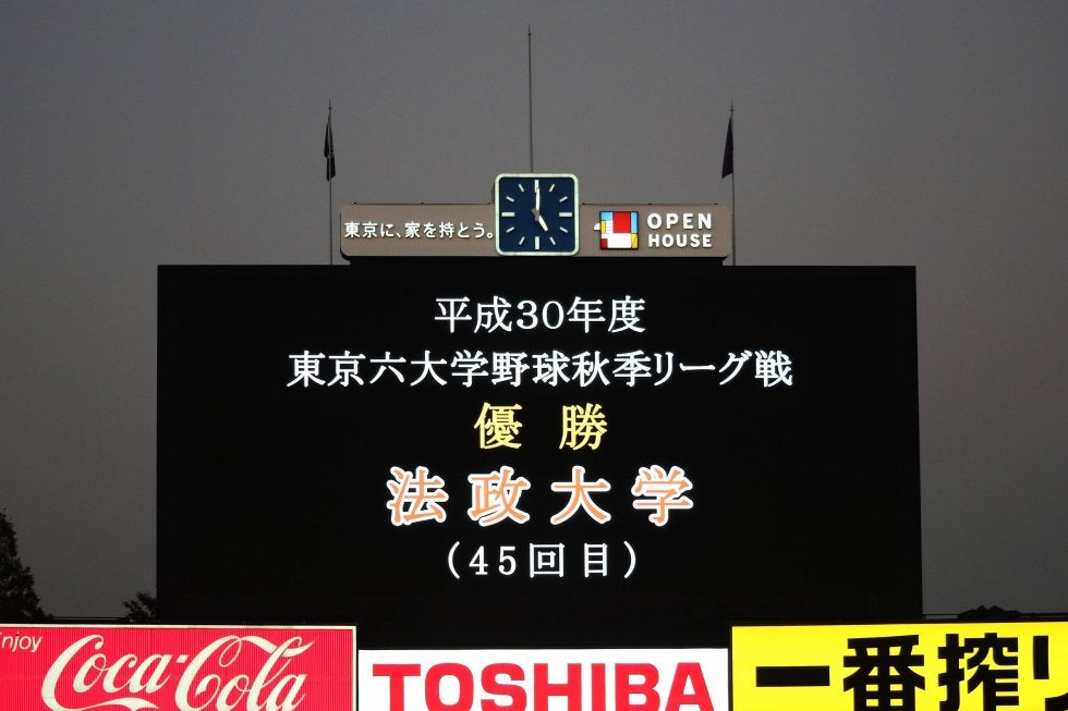 東京六大学野球の秋季リーグ戦の最終週、早慶戦の3回戦が29日に行われ、早大が5対4で慶大に勝利。その結果、勝ち点4で3校が並び、勝率で上回る法大の12季ぶり45度目の優勝が決まった。