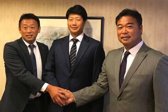 ロッテから5位指名を受けたHonda・松田進(中央)【写真提供:千葉ロッテマリーンズ】