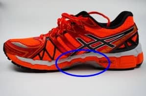 形は極力、フラットなものを選ぶようにしましょう。(ただし、足の運びをよくするために、つま先が上がっている靴もあります)シャンクとは、土踏まず(アーチ)のつぶれを抑制するためのパーツ。(上写真の青丸の部分。)最近では、このような芯がない靴もあるので、シャンクがある靴を選びましょう。