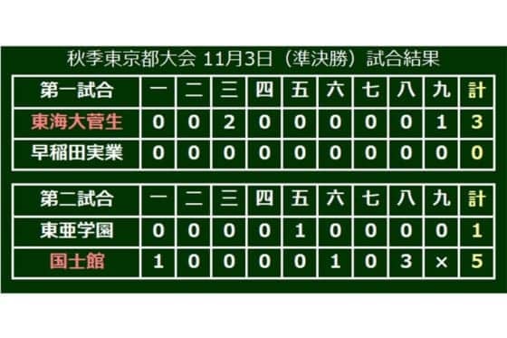 高校野球の秋季東京大会は3日、神宮球場で準決勝が行われ、東海大菅生と国士舘が勝って決勝戦に進出した。