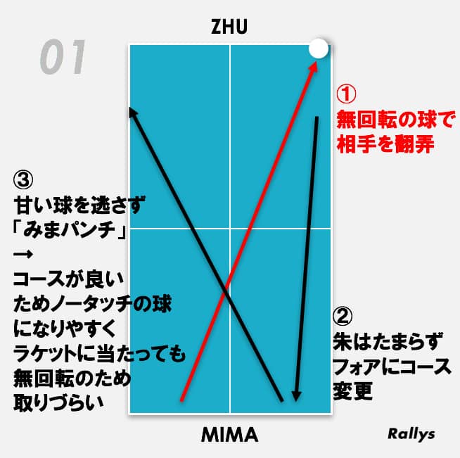 決勝を振り返ってみると、朱雨玲はバックハンド対バックハンドで戦うも、伊藤の表ソフトラバー(表面にツブツブがあるラバー。無回転のボールが出やすい。)から繰り出される独特の無回転のボールに苦しみ、思い切った攻撃ができない。そこでフォアにコース変更をした瞬間、伊藤の「みまパンチ」を食らってしまう展開が多かった。