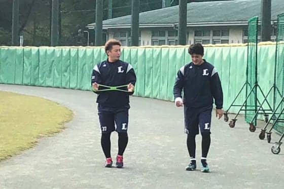 リハビリを行う西武・岡田雅利(左)【写真:岩国誠】