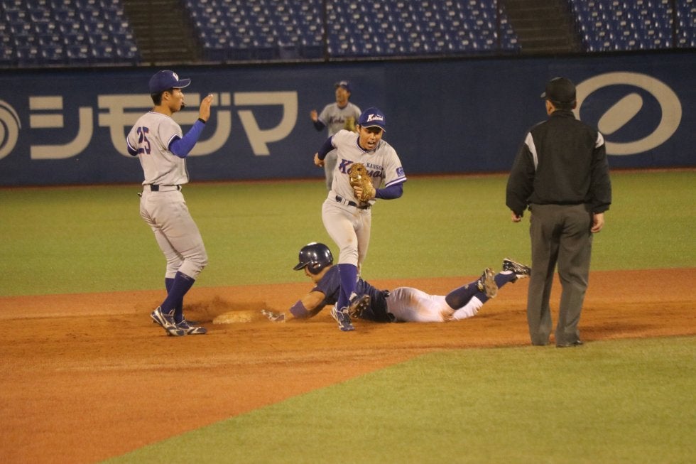 この試合を大きく動かすプレーがあった。関西国際大が2点リードの5回表、二死一、三塁という場面で創価大の1番・松村誠矢(4年・日本航空)の放ったセンター前に抜けそうな打球を二塁手の宇佐美秀真(4年・PL学園)がダイビングで好捕。そのまま二塁ベースを踏んで3アウト目を取り、得点を許さなかった。
