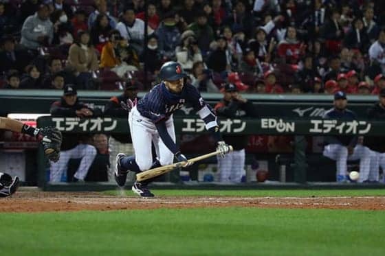 2点を追う9回。上林誠知外野手(ソフトバンク)、田中広輔内野手(広島)のタイムリーで同点に追いついた侍ジャパンは、なおも1死一、三塁の場面だった。打席に立った菊池は1ボールから2球目をセーフティスクイズ。万全のスタートを切った田中広が決勝ホームを踏んだ。