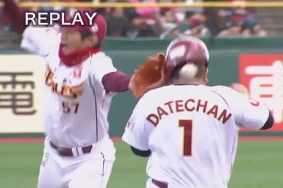 まずは牽制球を投じる松井。そして、伊達さんが塁を離れた瞬間に一塁手の中川内野手(現・DeNA)が隠し玉を決め、伊達さんは走ることなくアウトに。さすがにもう一度チャンスが与えられると、捕手の送球が伊達さんの首を直撃。