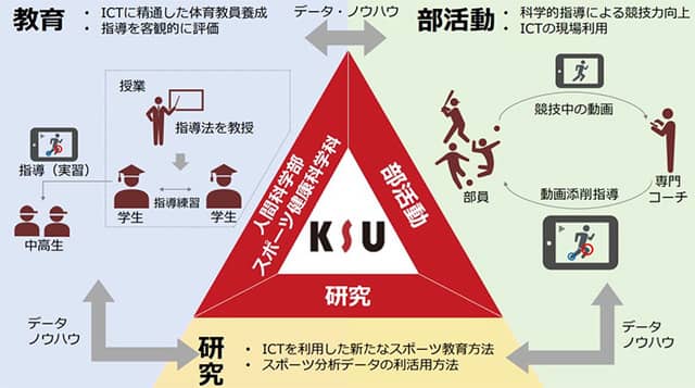 スポーツ指導法の実験は、剣道、バレーボール、ハンドボール、準硬式野球の部活動4種目。学生約100人がスマートフォンなどで競技中の姿を撮影してアップロードした動画に対し、九州産業大学の専門教員やコーチが文字や図形、音声などで動作の改善点などを指摘、システムを介してフィードバックする。