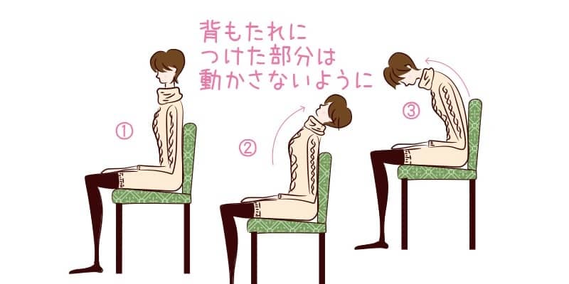 (3)頭から背もたれのすぐ上まで順番に背骨を元に戻したら、今度は背もたれのすぐ上の骨をその下の背骨の後ろを広げるように順番に前に曲げ、最後はおへそをのぞき込むように丸めて5~10秒止めます。