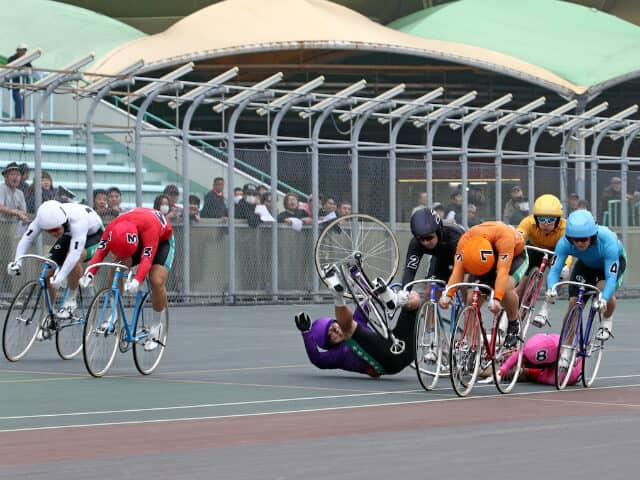 ゴール線間際、内でもつれた中嶋と鈴木が落車、後続の嘉永も巻き込まれるアクシデント。