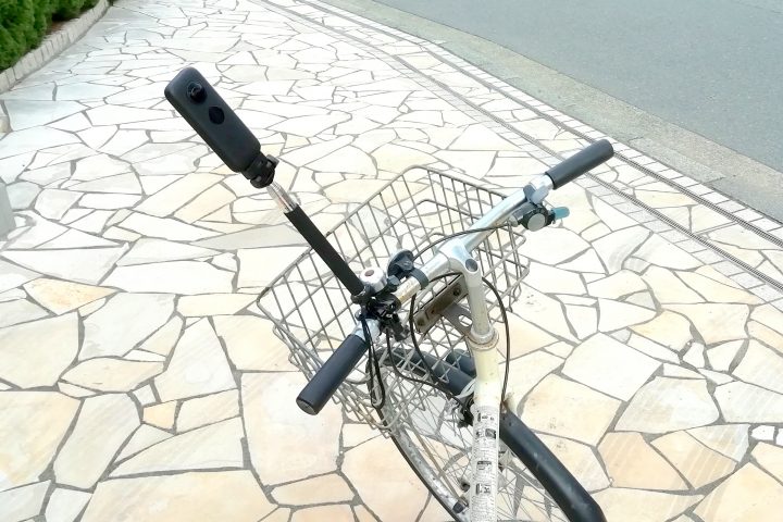 では自転車に取り付けてみたら、どんな映像が撮れるのでしょうか。そこで稲村ヶ崎の海岸線を江ノ島方面へ向けて、レンタサイクルで走ってみました。安全面への配慮から、Insta360 ONE Xは自転車にしっかりと固定。こうすることで、両手でハンドルを握って運転できます。