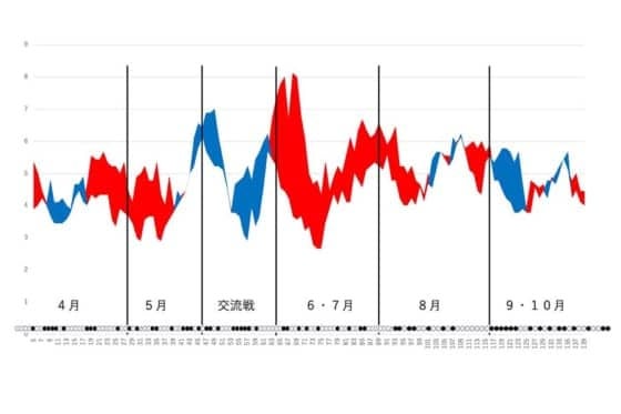 他のセ・リーグ5球団にとって勝率5割ラインがなかなか超えられない壁になっている最中、5月以降も着実に勝ち星を重ねていくカープ。交流戦は7勝11敗と負け越しでしたが、その期間を除けばほぼ厚いレッドゾーンとなっているグラフがシーズンの首位独走を物語っています。セ・リーグ6球団だけでの戦績は