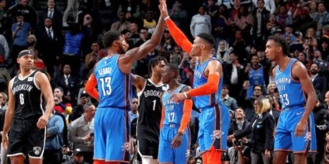 勝負強いウエストブルックか、それとも好調のジョージか。スローインのパスを受けたのはウエストブルック。ボールを持ったウエストブルックがドライブの体勢になるとネッツはドライブコースにヘルプディフェンスが立ち塞がろうとします。そこで空いたのはジョージ。ウエストブルックは迷わずパスを出し、ジョージも慌てずに追って来るディフェンスをフェイクでかわして打った3ポイントシュートが決勝点となり、サンダーが大逆転勝利を手にしました。