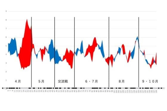 4月終了時点では、首位広島に2ゲーム差の2位につけていたのですが、その後交流戦前後に5連敗が1回ずつ、交流戦後7連勝したかと思えばすぐに6連敗と首位広島を追撃するには今ひとつ飛び出しきれない状況でした。オールスター戦以降は、得失点がほぼ均衡する薄氷のグラフが象徴するように、大きな連勝連敗もなく、勝率5割ラインを行ったり来たりの戦いぶりでした。