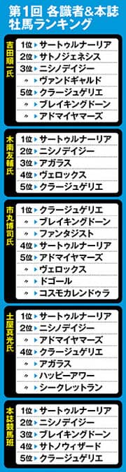 ※『Sportivaオリジナル番付』とは、デイリー馬三郎の吉田順一記者、日刊スポーツの木南友輔記者、独特なデータを駆使するパソコン競馬ライターの市丸博司氏、フリーライターの土屋真光氏、Sportiva編集部競馬班の5者それぞれが、来春のクラシックを目指す2歳牡馬の、現時点における実力・能力を分析しランク付け。さらに、そのランキングの1位を5点、2位を4点、3位を3点、4位を2点、5位を1点として、総合ポイントを集計したもの。