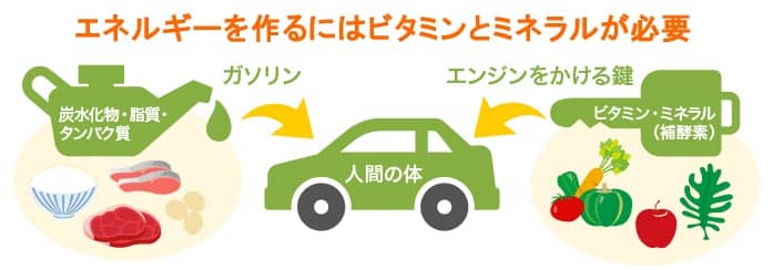 人間のカラダを車に例えると、食べ物からとる「タンパク質・脂質・炭水化物」はガソリンの役目をします。ガソリンが満タンの車のエンジンをかけるのが、タンパク質から作られる「酵素」とビタミン・ミネラルからなる「補酵素」です。