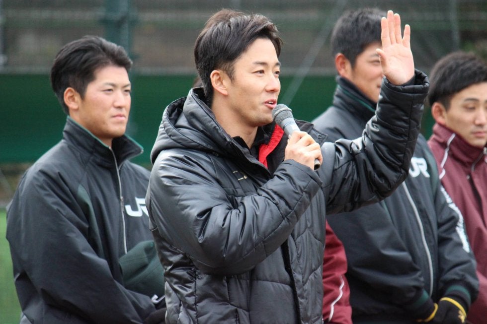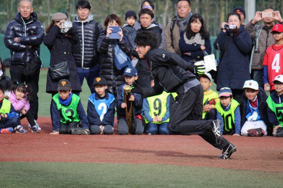 まずは参加したプロ野球選手(日本ハム・斎藤佑樹、巨人・重信慎之介)、プロ入りが決まった小島和哉(来季からロッテ)と社会人トップの現役選手らがキャッチボールやロングティーでのデモンストレーションを実施。重信は持ち前の俊足を生かした盗塁も披露し、子供たちはその都度「速い!」「おー!」と歓声を上げた。