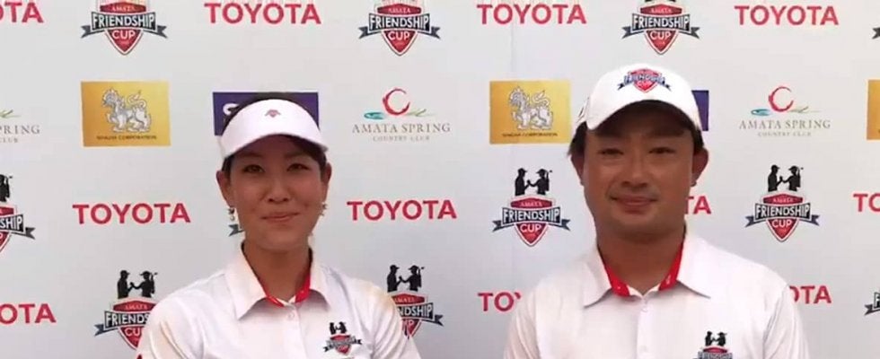 日本選抜とタイ選抜の対抗戦 アマタフレンドシップカップが現地時間22日、タイのアマタスプリングスを舞台に第2ラウンドが終了。日本は6ポイントで(勝利:1ポイント、引き分け:0.5ポイント)タイに4ポイントリードを許し、最終日を迎える。1UPで勝利した市原弘大&福田真未がインタビューに答えた。