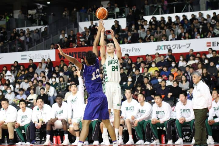 中部大学第一はリバウンドで身体を張り、福岡第一の武器であるトランジションの出どころを徹底してケア。福岡第一は速攻を封じられ、中部大学第一も相手のディフェンスをこじ開けられない我慢の時間帯に。それでも松崎、小川がその状況で貴重な3ポイントシュートを沈め、39-21で前半を終えた。
