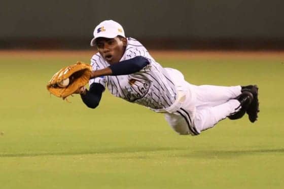 特に、このセニヴァイラスネの美技には温かい拍手が送られた。3回、藤原恭大(ロッテドラフト1位)の中前へのフライを懸命に追うと、最後は思い切って飛び込み、ダイビングキャッチ。写真を見ると、最後までボールを見て、グラブに収めていたことがよく分かる。セニヴァイラスネは2回にも小園海斗(広島ドラフト1位)の右中間への大飛球をランニングキャッチしていた。