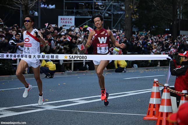 9区の新迫志希(スポ3=広島・世羅)は9キロ手前で一度集団から離されかけるもすぐさま追い付く。その後は集団を引っ張る攻めの走りを披露。2年からずっと不調だった男の追走で10位まで1分12秒差に詰め寄り、シード権獲得に望みをつないだ。そして10区にはこれが最初で最後の東京箱根間往復大学駅伝(箱根)となる小澤が出走。6キロ地点で11位の明大をかわし、さらにハイペースで前を追った。しかしシード権は遠く、さらには中継所から後ろに付かれていた中大に抜け出される。そしてシード落ちが確定して迎えた大手町の最後の直線。小澤は魂のラストスパートで中大に追い付く。その後、中大の選手もスパートをかけ、2人は並んでフィニッシュ。同タイムながら数センチの差で中大に軍配が上がったが、最後まで諦めない姿は人々の心を打った。