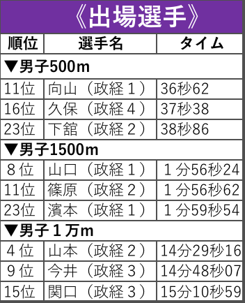 日本学生氷上選手権(以下、インカレ)が栃木県日光市で開幕し、初日の男子は500メートル、1500メートル、1万メートルが行われた。各種目15位以上に与えられるポイント合計で争われる大学対抗の部門総合順位で4位につけ、幸先のいい滑り出しとなった。