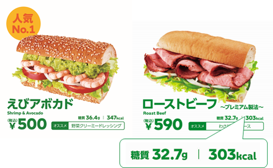 なお、サブウェイは、店頭に設置するグランドメニューポスターのほか、注文カウンターに設置するメニュー表にも糖質を表示。さらに、同社ホームページではサンドイッチメニュー以外にも、サラダメニューやパン・トッピング・ドレッシングの各糖質含有量を表示した栄養情報一覧を掲載しています。