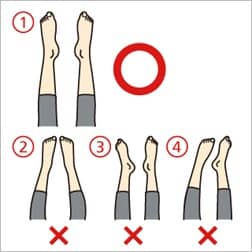 まずは自分の身体のゆがみをチェックします。仰向けになり、リラックスしてから自分の足先の状態がどの状態に近いか見てみましょう。