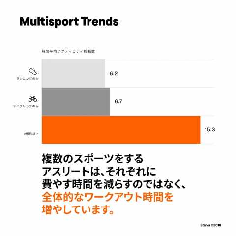 複数のスポーツをすることで相乗効果が高まり、全体的なワークアウトの時間が増えるほか、グループで行うことでアクティビティの時間や距離が長くなる傾向もあるそうです。