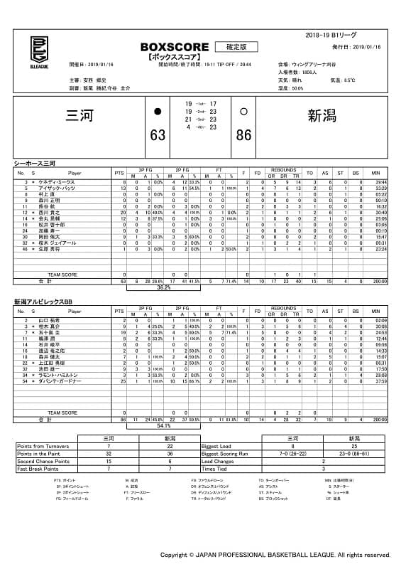 3Q 三河59–63 新潟 (三河21–23 新潟)