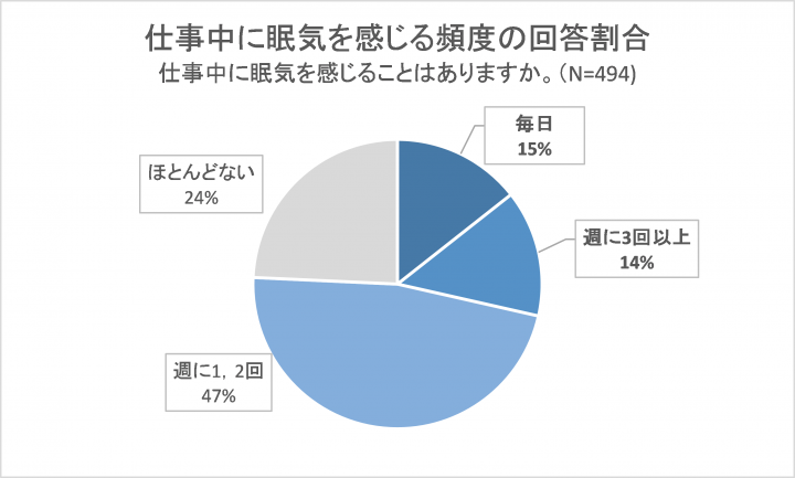 そんな睡眠負債を抱えているビジネスパーソン、やはり仕事にも影響があるようです。今回の調査によれば、約8割は仕事中に眠気を感じると回答しているほか、うち約3割が、週3回以上~毎日と頻繁に眠気を感じていることが分かります。