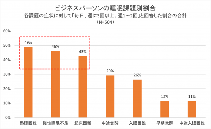 さて、皆さん、睡眠に対して具体的にどのような課題を抱えているのでしょうか? 今回の調査結果によれば、三大睡眠課題は、「慢性睡眠不足」・「熟睡困難」・「起床困難」という結果に。