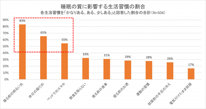 睡眠の質に影響する生活習慣は多数ありますが、今回の調査では「寝る前の明るい光」(83%)、「休日の寝だめ」(65%)、「ベッドでのスマホ」(55%)などが高い割合となっています。