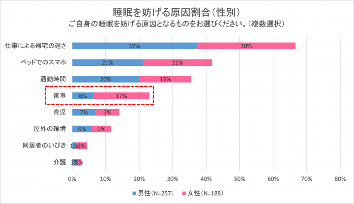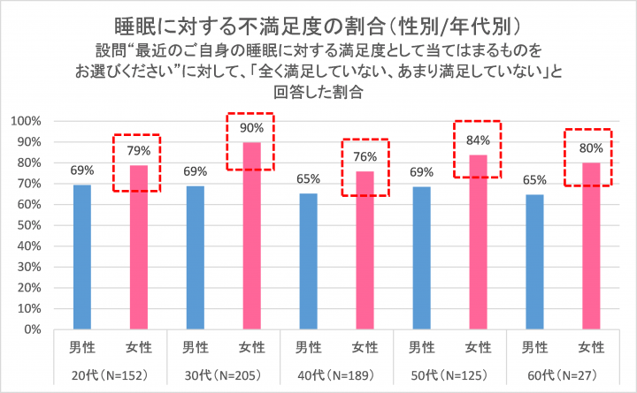 平均睡眠時間の短さ、そして、睡眠に対する不満足度の高さも、女性が男性を多くのポイントで上回っています。