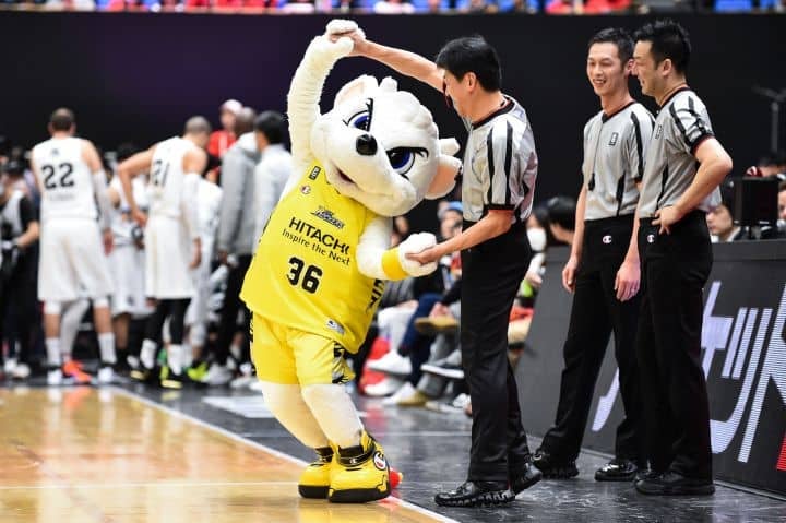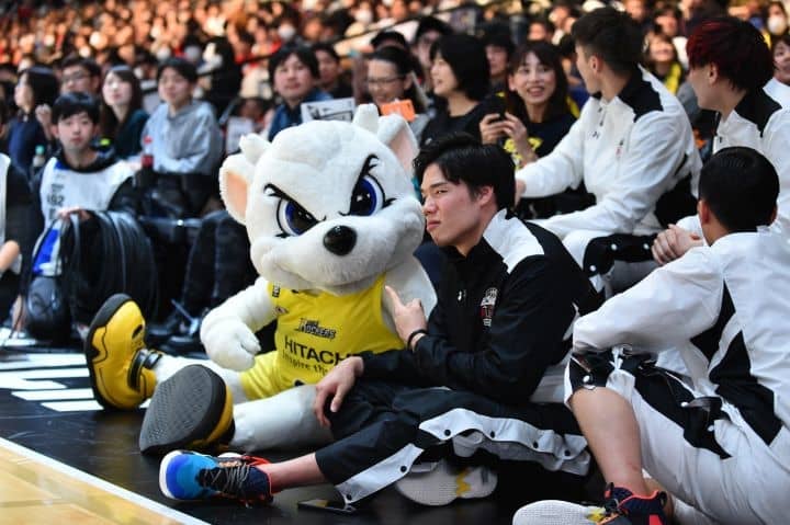 出てくるや否や、ゴーディーを押し倒すマスコットハンター川村卓也(横浜)。バスケット愛&マスコット愛が抑えきれない様子。