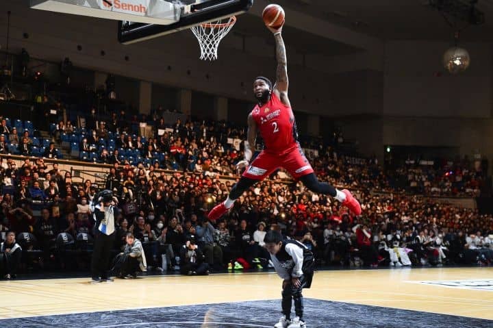 ケガのジャスティン・バーレルに代わってダンクコンテストに出場したマーキース・カミングス(名古屋D)。滞空時間の長いキッズ超えダンクは流石!