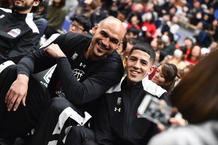 NBAでの経験も豊富なロバート・サクレ(SR渋谷)はオールスターの舞台がよく似合った。チームメートのベンドラメ礼生と記念撮影。