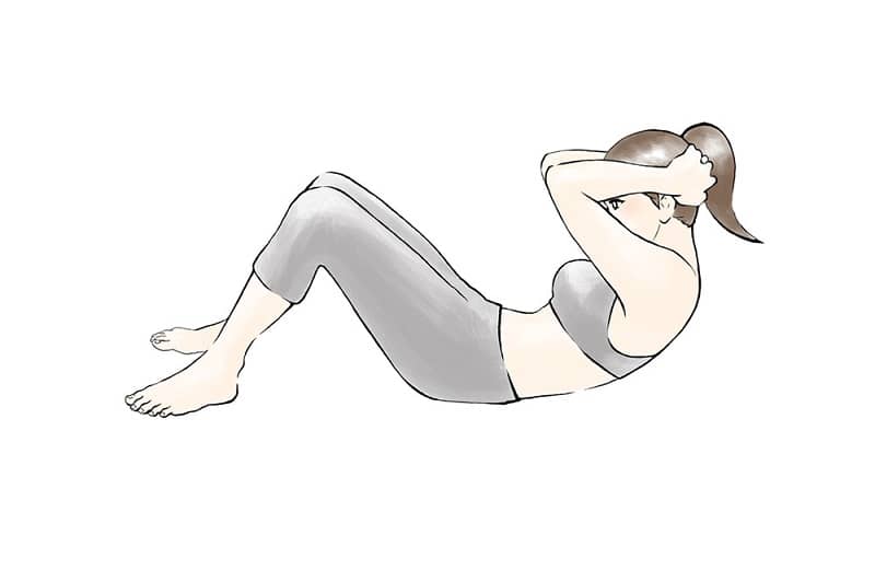 上体を起こすときは、肩甲骨が浮くくらいまでで大丈夫。腰が床から離れるまで上体を起こすと、使う筋肉が腹筋ではなく股関節まわりの筋肉に移動してしまいます。