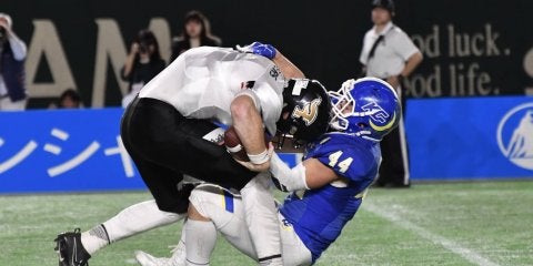<写真・QBサックを決めた海崎〉試合後のコメント鳥内秀晃監督「あんなランナーおったら試合にならへん。学生たちが一生懸命戦…