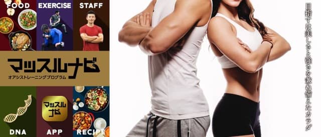 「マッスルナビ」は、プログラム開始時に遺伝子検査を行い、効率的に筋肉増量やボディメイクによる魅力のあるカラダを目指すマンツーマンプログラムだ。遺伝子検査によって肥満遺伝子の変異による4つのタイプ別に適切なたんぱく質摂取を行う食事指導と、フリーウェイトを中心とした正しいトレーニングを行う。