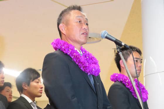 宮崎空港で行われた歓迎セレモニーで報告する西武・辻発彦監督【写真:岩国誠】