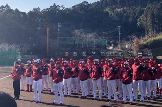 広島カープの日南キャンプスタートに先立ち、1日に日南市民歓迎セレモニーが天福球場で行われ、崎田恭平市長の挨拶、地元の特産品の贈呈、地元の幼稚園児らからオリジナルの歌をプレゼントされるなど、終始和やかなムードに包まれた。