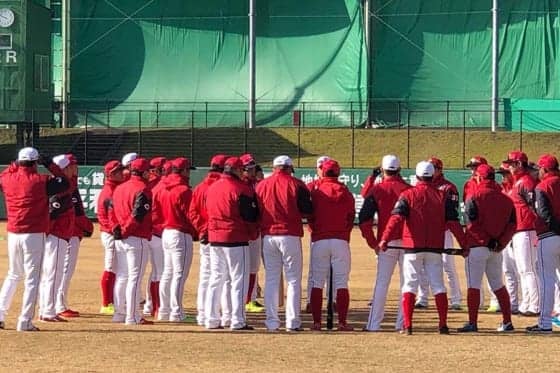 練習前の円陣では、新加入した選手が大きな声で挨拶。巨人から移籍した長野久義選手が「今日からシーズンが始まります。日本一に向けみんなで頑張っていきましょう。野球以外のことなら何でも答えられるので聞いてきてください」と元気良く挨拶。続いて新人選手の挨拶では、高卒ながら1軍に抜てきされた小園海斗内野手が「よろしくお願いします」と控えめに挨拶すると上本崇司内野手が「新人の小園です。田中さんからレギュラー取れるように頑張ります!」と後ろからいじって笑いを誘うシーンも。正隨優弥外野手は目標として挙げるはずの鈴木誠也外野手の名前を間違えて円陣がどっと湧くなど笑顔から全体練習がスタートした。(沢井史 / Fumi Sawai)