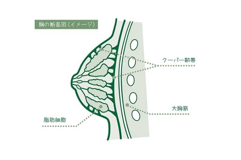 胸の脂肪や乳腺は、乳房内に張り巡らされた「クーパー靭帯」と呼ばれる結合組織に支えられて、丸みのある美しい形がキープされています。