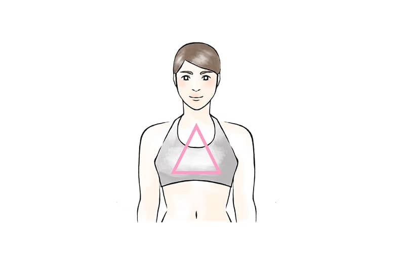 普通のブラは鎖骨の中心と左右の乳頭が正三角形の位置になるように前かがみになってブラを着けますが、スポーツブラの場合は上体を起こしたまま着けて大丈夫。自分本来の胸の位置に着けるので、鎖骨の中心と左右の乳頭は二等辺三角形になります。