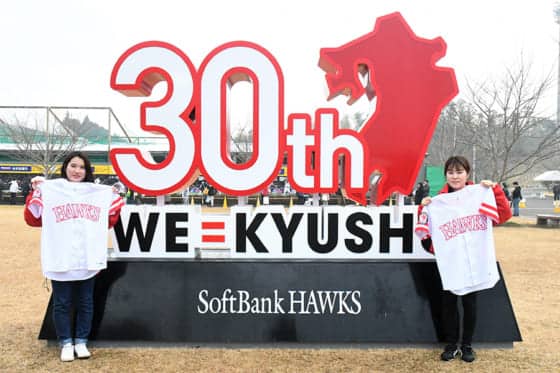 今年はホークスにとって福岡移転30周年。「WE=KYUSHU(ウイー イコール キュウシュウ)」のコピーを掲げ、さまざまな企画が用意されている。その1つが、九州5都市で開催する「WE=KYUSHUデー」だ。この日は選手が「WE=KYUSHUユニホーム」を着用するとともに、入場者全員に同ユニホームのレプリカが配布される。