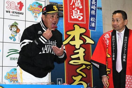 鷹キャンプ地に本マグロ1本登場 長崎・鷹島が地元名産の鷹島本マグロを贈呈 | 野球