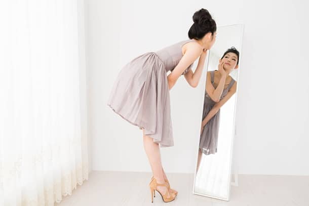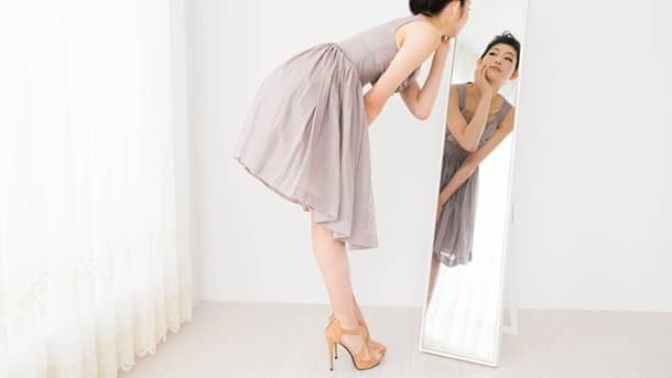 この「歩き方」のクセや悩みはO脚やX脚が原因にあるかもしれません!もし、心当たりがあるなら全身を映し出せる鏡で両かかとをつけて立ち、自分の脚をチェックしてみましょう。