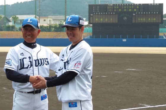 西武・辻監督(左)、多和田真三郎【写真:岩国誠】