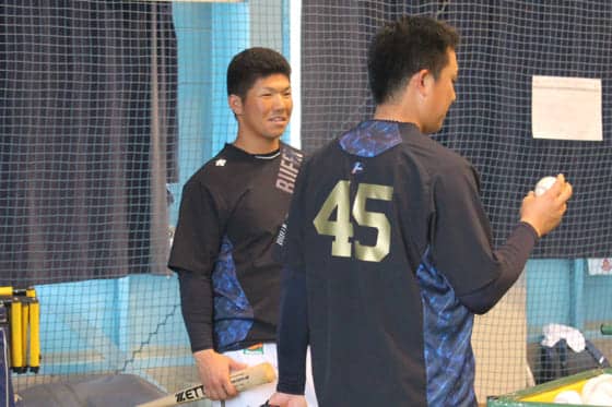 今キャンプ初の1軍練習に合流したオリックス・頓宮裕真(左)【写真:橋本健吾】