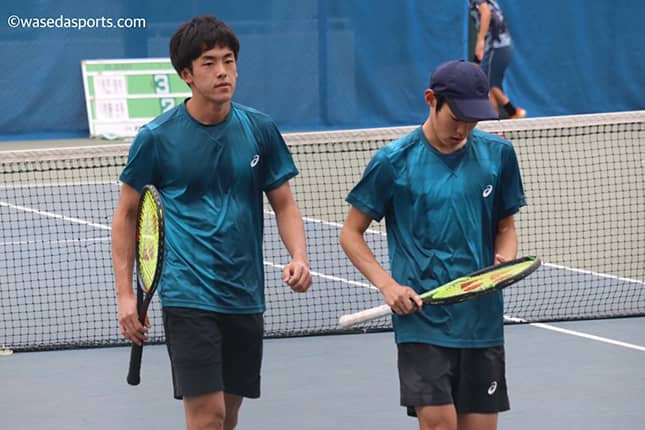 男子ダブルス準々決勝。佐藤祥・本多組はベスト16で小林雅哉(スポ3=千葉・東京学館浦安)・樋口廣太郎(スポ2=福岡・柳川)組を破った合戸廉太郎・田中瑛士組(明大)と対戦した。ファーストセットは互いにサービスキープをしあう展開が続いたものの、第1ゲームに許したブレークが尾を引く形となり、ワンブレークアップでこのセットを献上してしまう。それでもセカンドセットは「相手の前衛の動きに対してしっかり逆をついたり、空いているところに打てるようになった」(本多)と1−1で迎えた第3ゲームから5ゲームを連続で奪い、勝負は10ポイントマッチのスーパータイブレークへ持ち込まれた。