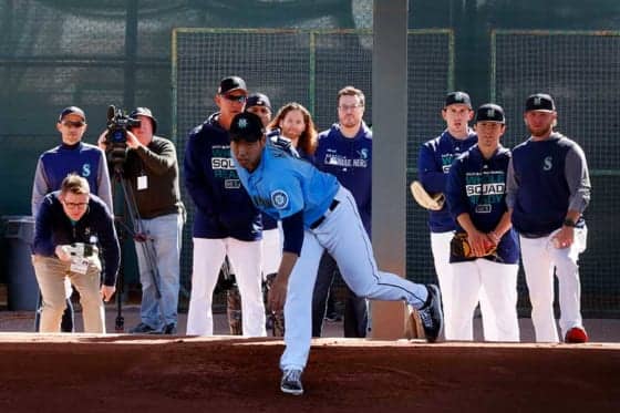 マリナーズの菊池雄星投手が19日(日本時間20日)、米アリゾナ州ピオリアでのキャンプで初の実戦形式の投球練習(ライブBP)を行った。登板前の投球練習では背後からイチロー外野手が見つめていたが、緊張と集中からか憧れの先輩の気配に気づかず。後から聞かされると「マジですか! 教えてください」と報道陣に懇願する場面も見られた。